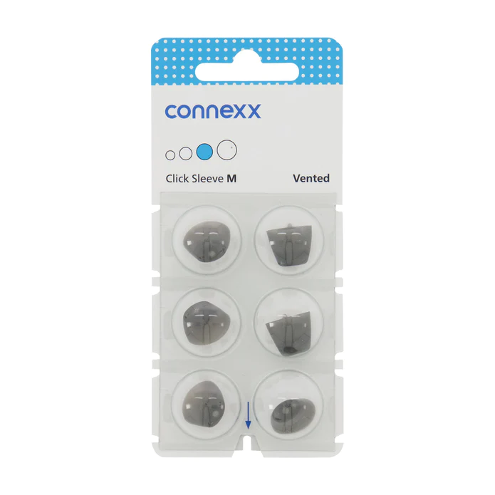 The Connexx Click Sleeve Vented is a set of stainless silicone tips designed to safeguard your hearing aids while ensuring they stay comfortably in place inside your ear. These sleeves are compatible with small, medium, or large size ear canals.Therefore, you can select the version that precisely suits your ears. Furthermore, the sleeves are easy to switch, allowing you to effortlessly change between different versions throughout the day.