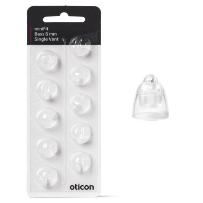 The Oticon Minifit Bass-Dome with a single vent is crafted from a soft material that comfortably adapts to your ear. The flexible slats ensure a perfect fit within the ear canals, while the ventilation holes allow air to circulate, preventing that stuffy feeling. As a result, you enjoy a personalized fit and a more comfortable listening experience when using Oticon Minifit Domes.