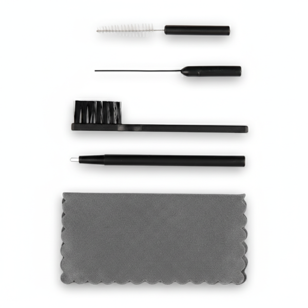 Complete cleaning kit for hearing aids. Includes brushes, cleaning wire, magnet needle, and microfiber cloth for safe daily maintenance.