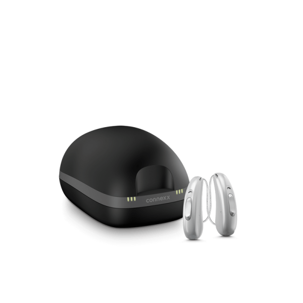 Closed charging station for Rexton hearing aids with lithium-ion batteries.