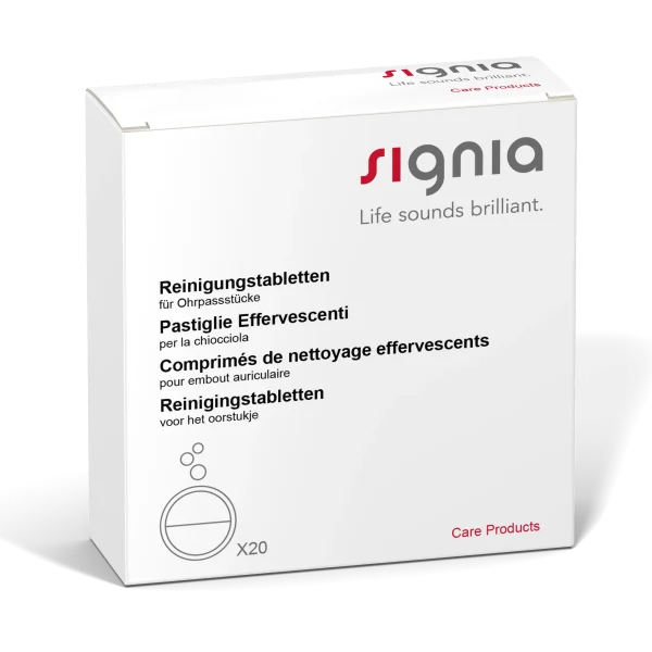 For the cleaning of your domes, you have the option to bathe them either daily or weekly. Simply dissolve the tablets in water and soak the domes for at least 15 minutes. Before using them, ensure thorough drying and proper clearance of the sound tubes. Utilizing the Signia Air Blower can easily help achieve this.